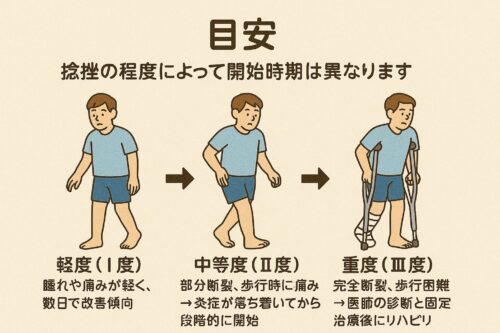 • 軽度(Ⅰ度):腫れや痛みが軽く、数日で改善傾向 → 早期から軽いリハビリ可