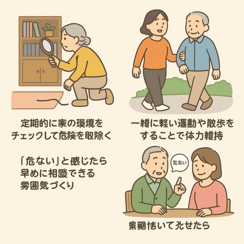 高齢者自身だけでなく、周囲の協力も転倒予防には欠かせません。