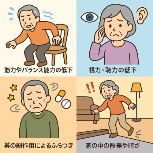 高齢者が転倒しやすいのは、次のような要因が重なっているからです。