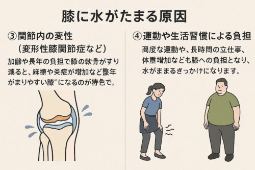過度な運動や、長時間の立ち仕事、体重増加なども膝への負担となり、水がたまるきっかけになります。