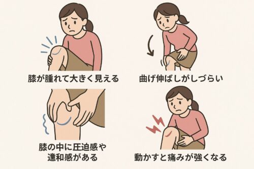 膝に水がたまると、次のような症状が現れることがあります。