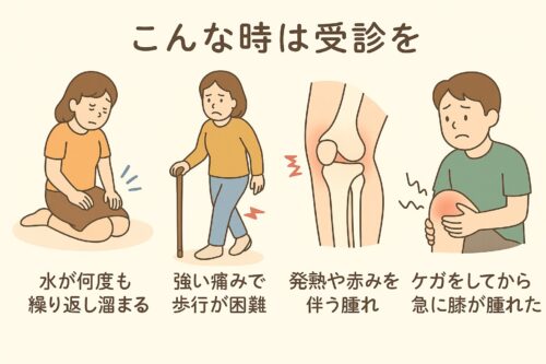 単なる「水がたまった」だけではなく、感染や靭帯損傷が隠れていることもあるため注意が必要です。