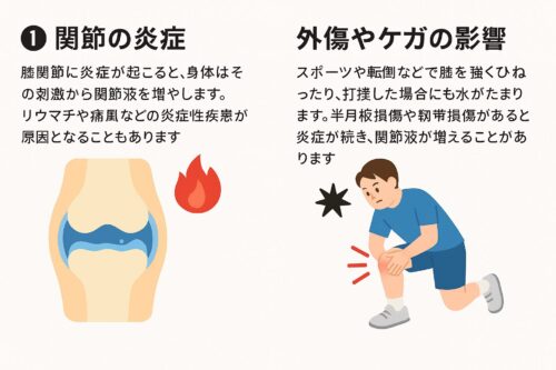 膝関節に炎症が起こると、身体はその刺激から関節を守ろうとして関節液を増やします。リウマチや痛風などの炎症性疾患が原因となることもあります。