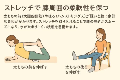 ストレッチを取り入れることで膝の動きがスムーズになり、水がたまりにくい状態を目指せます。