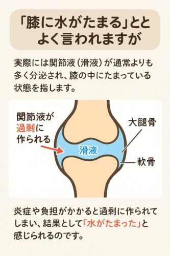 「膝に水がたまる」とよく言われますが、実際には 関節液(滑液) が通常よりも多く分泌され、膝の中にたまっている状態を指します。