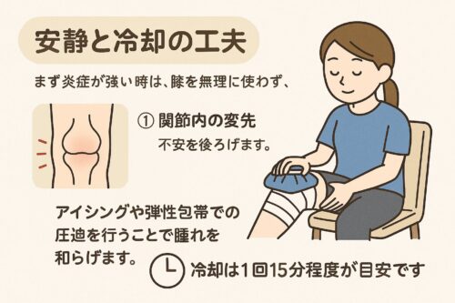 まず炎症が強い時は、膝を無理に使わず、アイシングや弾性包帯での圧迫を行うことで腫れを和らげます。