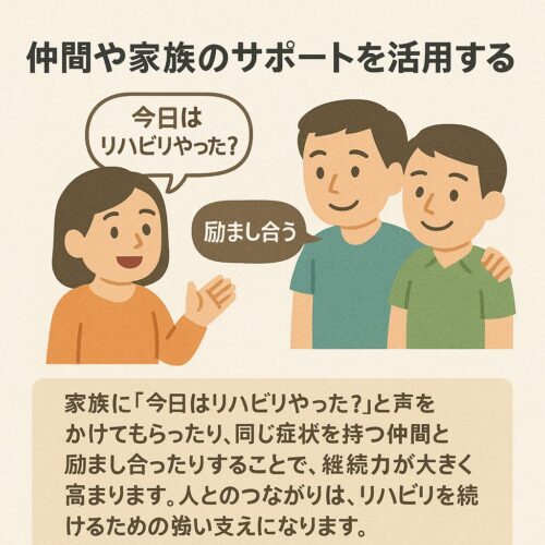 家族に「今日はリハビリやった?」と声をかけてもらったり、同じ症状を持つ仲間と励まし合ったりすることで、継続力が大きく高まります。