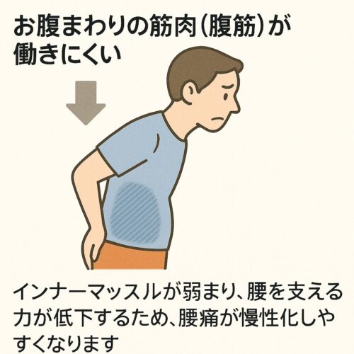 インナーマッスルが弱まり、腰を支える力が低下するため、腰痛が慢性化しやすくなります。