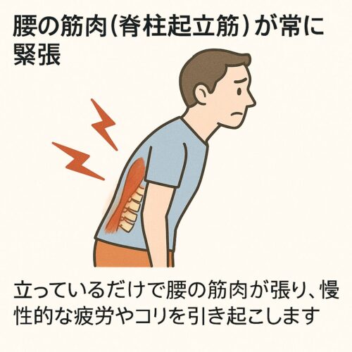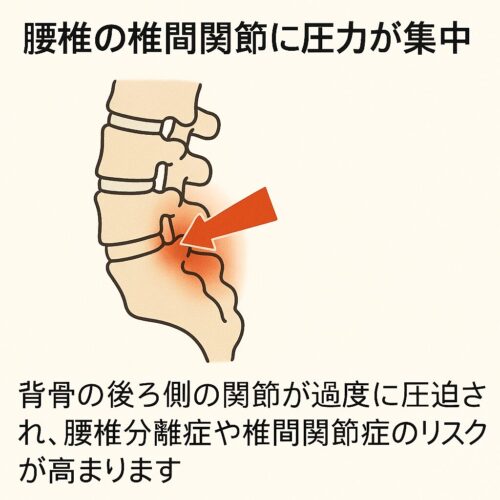 背骨の後ろ側の関節が過度に圧迫され、腰椎分離症や椎間関節症のリスクが高まります。 - 腰の筋肉(脊柱起立筋)が常に緊張