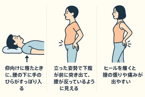 特に腹筋・殿筋が弱いと、腰を支えられず反りやすくなる。 - ヒール靴や姿勢の癖