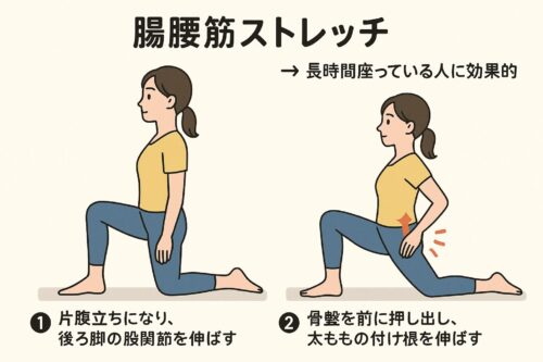 - 骨盤を前に押し出し、太ももの付け根を伸ばす