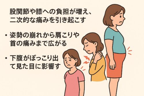- 股関節や膝への負担が増え、二次的な痛みを引き起こす