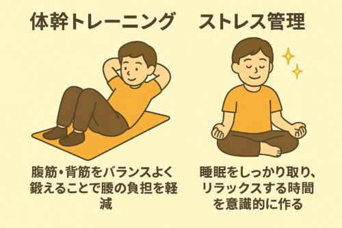 - 腹筋・背筋をバランスよく鍛えることで腰の負担を軽減