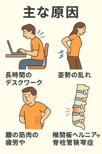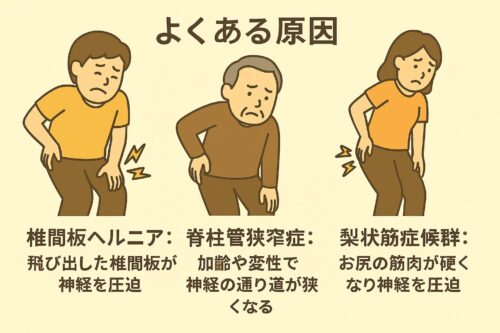- 椎間板ヘルニアや脊柱管狭窄症といった構造的な問題